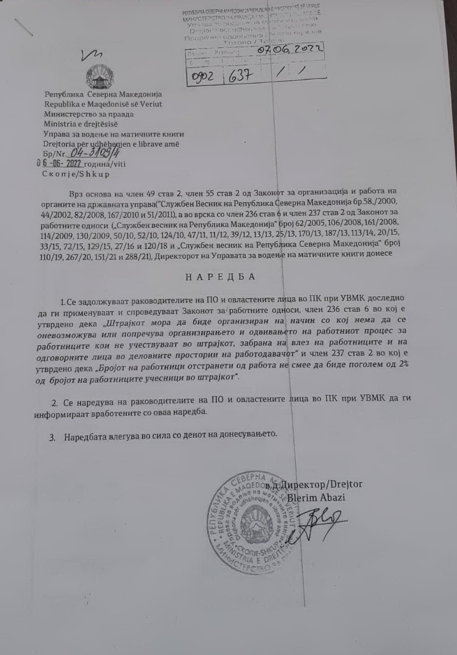 Инаку, вработените во Управата за водење матични книги бараат потпишување колективен договор, линеарно зголемување на платите за 30 отсто и подобрување на условите за работа.