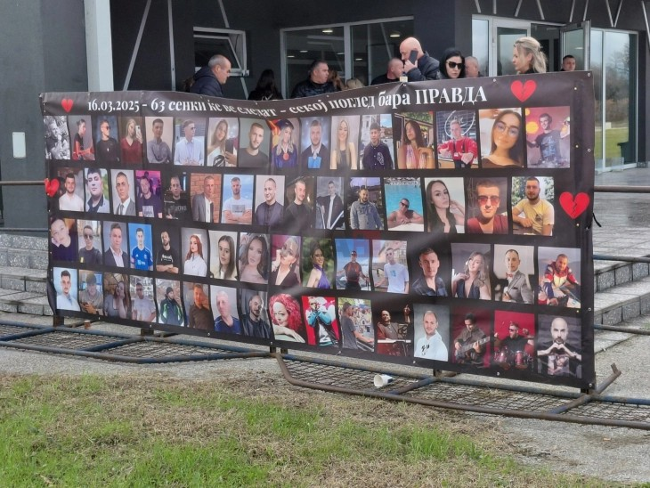 Откако на минатото рочиште сите обвинети изјавија дека не се чувствуваат виновни за делата кои им се ставаат на товар, родителите на загинатите денеска пред судот поставија транспарент со ликовите на сите 63 деца коишто ги загубија животите во пожарот во дискотеката “Пулс” порачувајќи дека било многу контрадикторно што никој од обвинетите не се изјаснил за виновен.