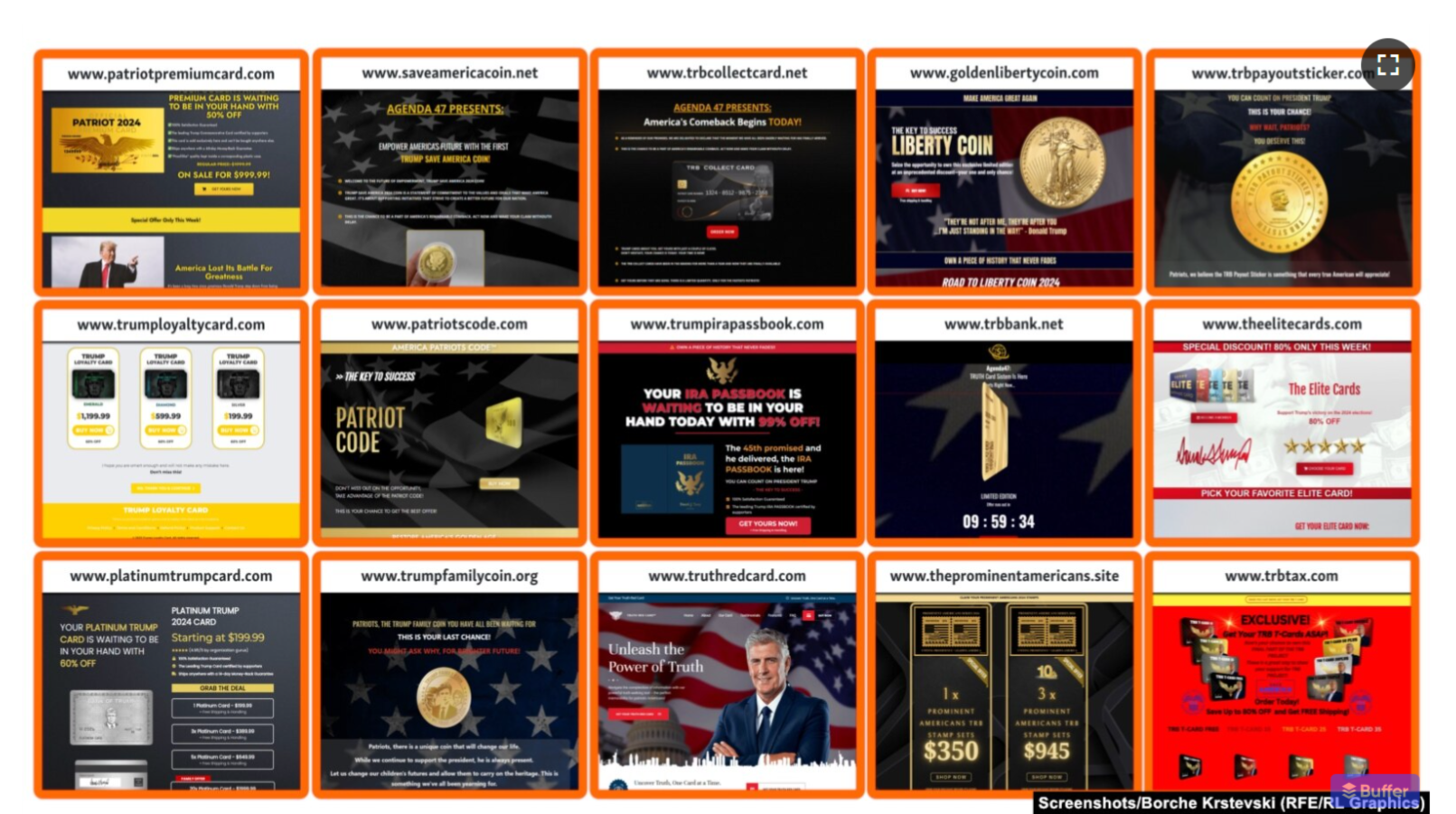 Токму на американскиот дел од платформата се регистрирани повеќе од 80 веб-страници кои ги анализираше РСЕ. Со прегледување на производите кои се регистрирани на платформата може да се утврди дека 90 отсто од понудите на виртуелните трговци во продажбата се „Трамп картички“, монети и слични производи од овој тип.
