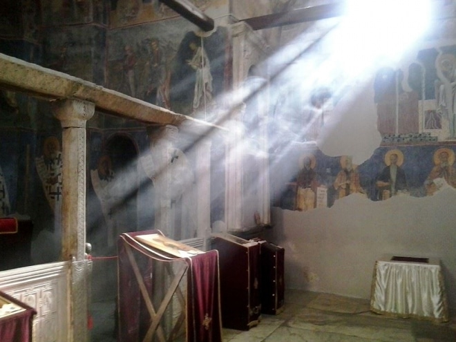Се до средината на 14 век, манастирот бил целосно зачуван и според зачуваните податоци поседувал богата манстирска ризница. Оттогаш, во аналите за манастирот се споменуваат кобни судби – земјотреси, пожари грабежи и разурнувања, во кои неповратно исчезнал голем дел од неговото богатство. Првото поголемо оштетување случило во земјотресот од 1550 година. Набргу таа била обновена, а новоизградените фреско-живописи повторно ги изработил непознат зограф.
