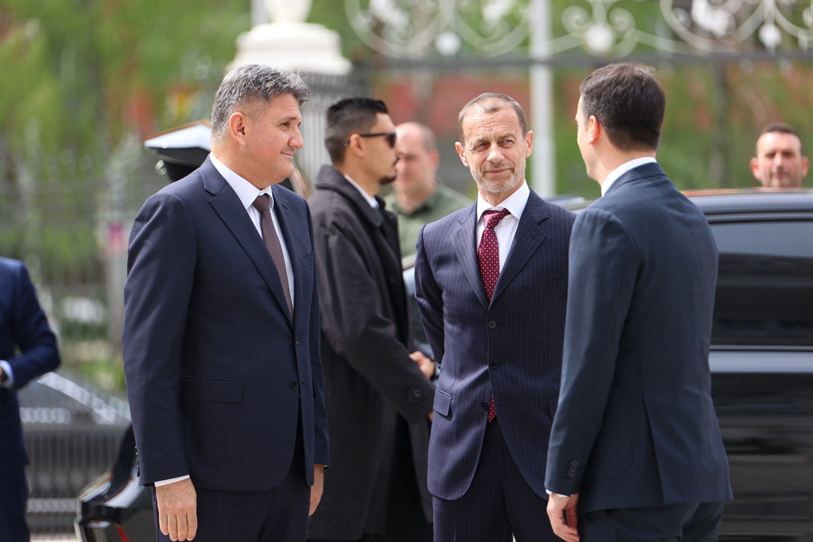 Премиерот Христијан Мицкоски, денеска во Владата оствари средба со претседателот на УЕФА, Александар Чеферин кој е во официјална посета на Македонија, на покана на претседателот на ФФМ, Масар Омерагиќ.