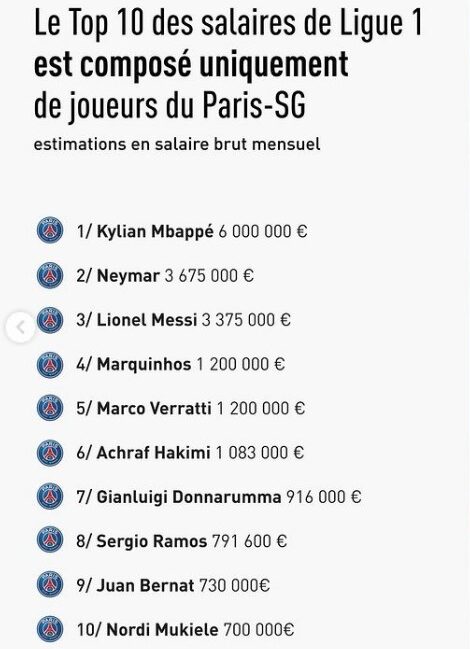 Францускиот шампион ПСЖ во изминатите десет години вложи огромни пари во градењето на тимот. Фудбалерите на овој тим заработуваат неверојатни бројки, а L’Equipe објави месечни плати од кои боли глава.