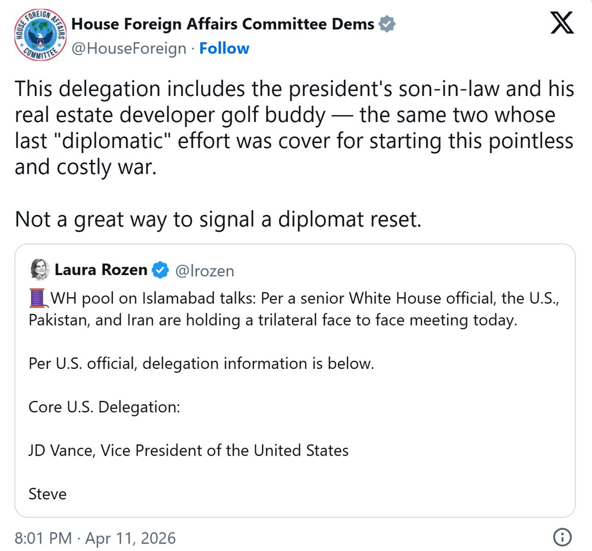 Демократите во Комитетот за надворешни работи на Претставничкиот дом на САД го критикуваа учеството на Џаред Кушнер и Стив Виткоф во преговорите со Пакистан. Во објава на социјалната мрежа X, тие истакнаа дека американската делегација ја сочинуваат „зетот на Трамп и неговиот пријател, претприемач за недвижности со кој игра голф“.
