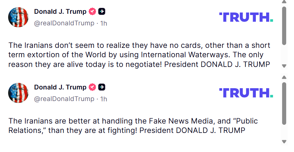„Иранците како да не сфаќаат дека немаат адути, освен краткорочно изнудување на светот во врска со користењето на меѓународните водни патишта. Единствената причина зошто се живи денес е да преговараат! Претседателе ДОНАЛД Џ. ТРАМП“, напиша тој.