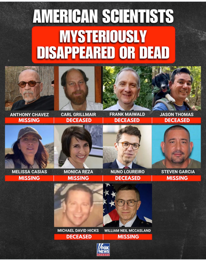 Научниците од НАСА, Мајкл Дејвид Хикс и Френк Мејвалд, починале под непознати околности на релативно рана возраст, додека фармацевтскиот истражувач Џејсон Томас, кој тестирал лекови за рак, бил пронајден мртов во езеро во Масачусетс на 17 март 2026 година, откако исчезнал без трага во декември 2025 година.