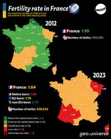 INSEE објави дека стапката на фертилитет паднала минатата година на 1,56 деца по жена, најниско ниво од Првата светска војна и далеку под 1,8 предвидени од советодавниот совет за пензии во своите прогнози за финансирање на пензии. Во 2023 година, последната година за која беа направени споредби со другите членки на ЕУ, Франција се рангираше на второ место со стапка на наталитет од 1,65, зад Бугарија, која имаше стапка од 1,81.