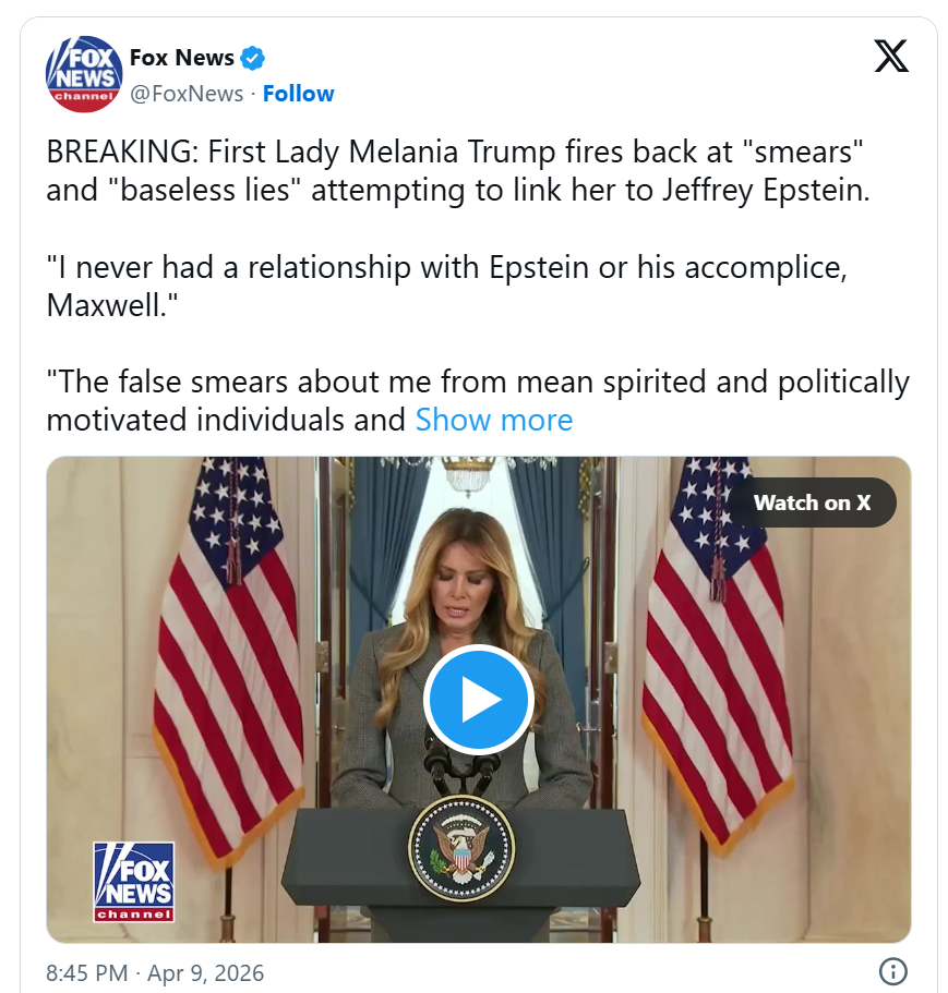 Во неочекуваното обраќање во четврток, кое дописникот на Скај њуз од САД, Марк Стоун, го нарече „апсолутно изненадувачко“, првата дама го повика Конгресот да одржи сослушувања каде што жртвите на Епштајн би можеле да сведочат.