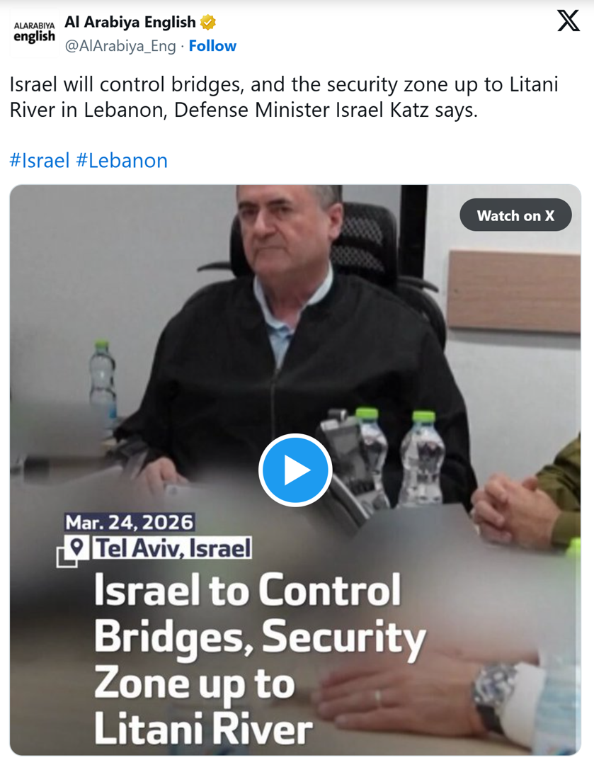 Израелската армија ќе го окупира јужен Либан до реката Литани, изјави министерот за одбрана Израел Кац, давајќи ја првата јасна изјава на Израел за својата намера да окупира делови од либанската територија.