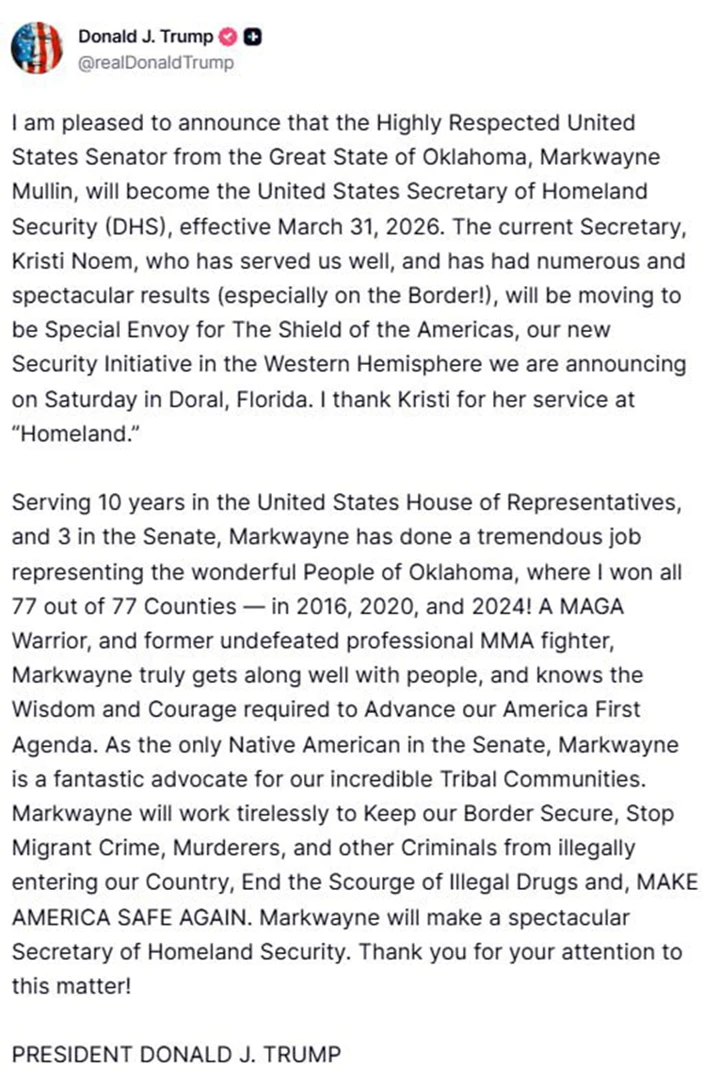 „Со задоволство објавувам дека високо почитуваната сенаторка на Соединетите Американски Држави од големата држава Оклахома, Марквејн Малин, ќе стане секретарка за внатрешна безбедност (DHS) на САД на 31 март 2026 година“, напиша Трамп во објава на неговата социјална мрежа Truth Social.