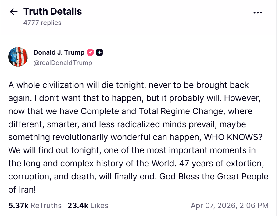 „Целата цивилизација ќе умре вечерва и никогаш нема да се врати. Не сакам тоа да се случи, но веројатно ќе се случи. Сепак, сега кога имаме целосна и тотална промена на режимот, каде што преовладуваат различни, попаметни и помалку радикализирани умови, можеби ќе се случи нешто револуционерно и прекрасно, којзнае? Ќе дознаеме вечерва, во еден од најважните моменти во долгата и сложена историја на светот. 47 години уцена, корупција и смрт конечно ќе завршат. Бог да ги благослови големите луѓе на Иран!“, рече Трамп во објавата на нејзината платформа Truth Social.