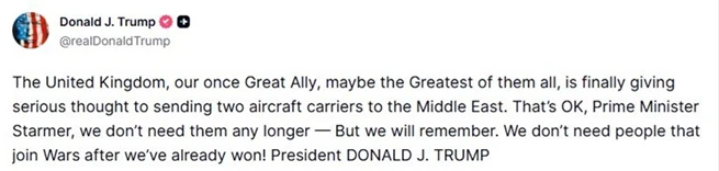 Американскиот претседател Доналд Трамп објави порака упатена до британскиот премиер Кир Стармер на својата социјална мрежа Truth Social, во која коментираше за евентуалното британско воено вклучување на Блискиот Исток.