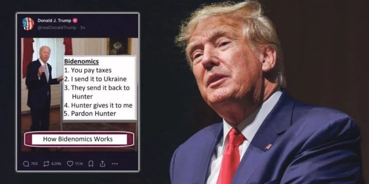 Американскиот претседател на САД, Доналд Трамп, објави на социјалната мрежа Truth Social фотографија на која се потсмева на финансирањето на Киев од страна на претходниот претседател на САД, Џо Бајден.