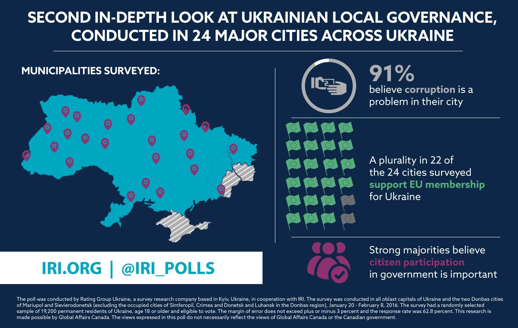 Но, иатражувањата во Укарина покажуваат дека над 90% од граѓаните во поголемите украински градови сметаат дека корупцијата е проблем во нивниот град.