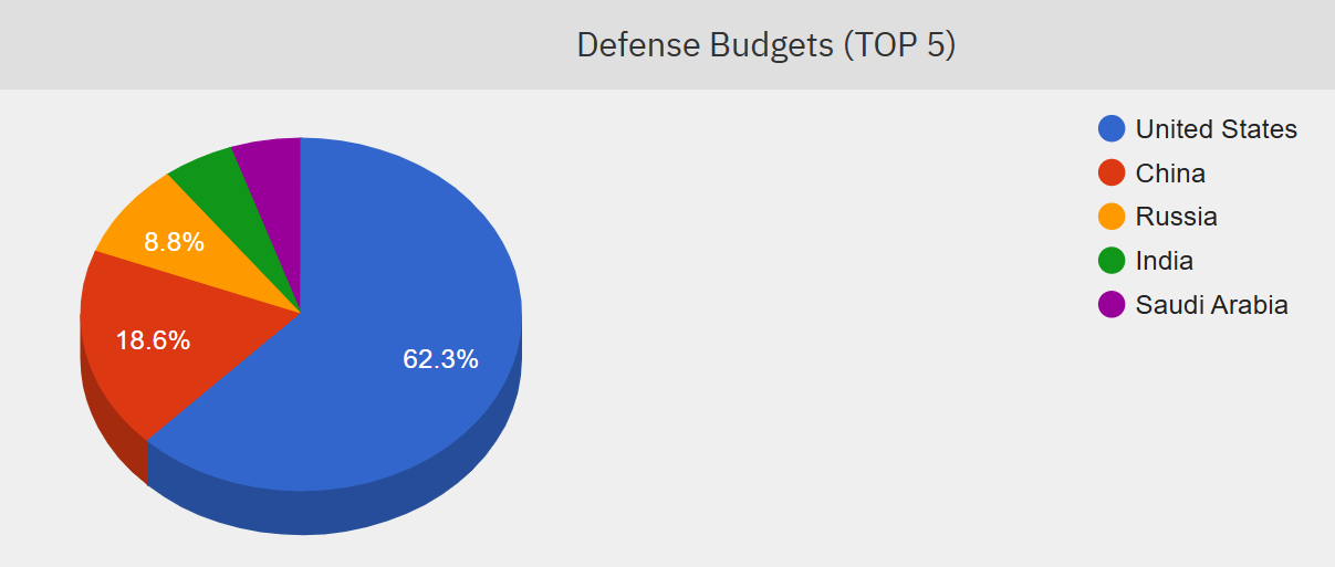 А доколку се одобри зголемувањето на американскиот воен буџет за дополнителни 500 милијарди долари тој би бил поголем од сите други 20 најголеми буџети во светот - заедно. Или, шест пати поголем буџет од Кина, десет пати поголем воен буџет на Русија или три пати поголем од воените буџети на големите европски држави заедно.