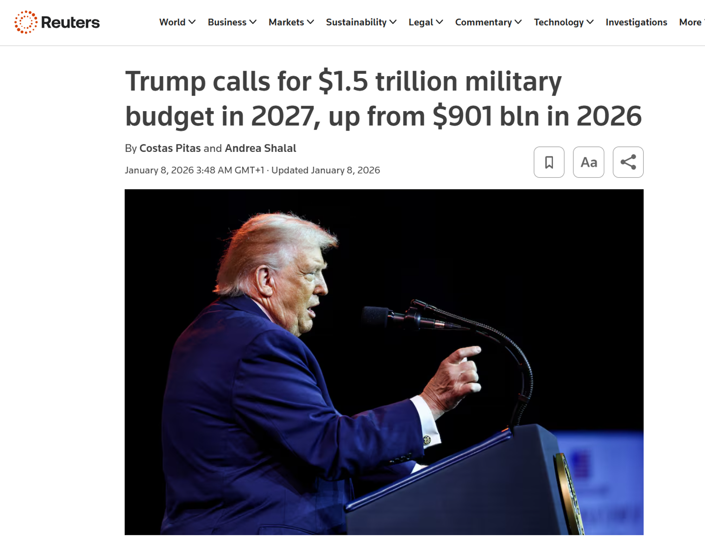 “Претседателот Доналд Трамп во среда изјави дека воениот буџет на САД за 2027 година треба да биде 1,5 трилиони долари, значително повисок од 901 милијарда долари одобрени од Конгресот за 2026 година, зголемувајќи ги резервите за одбрана, но предизвикувајќи скептицизам кај буџетските експерти.