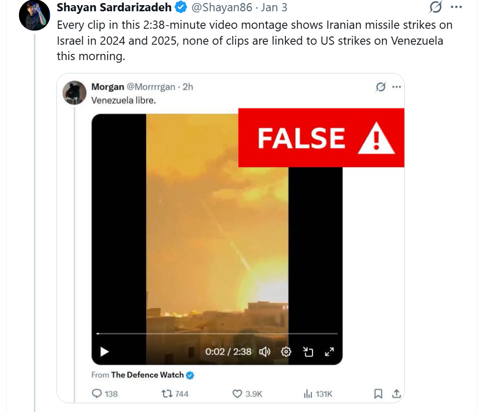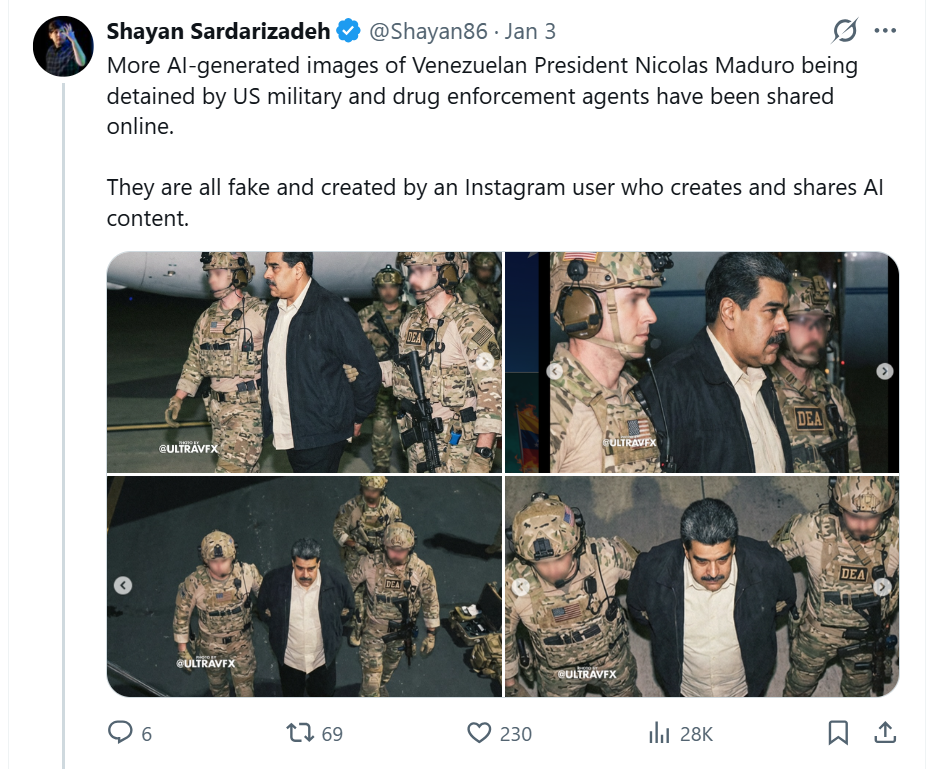 Неколку минути откако претседателот на Соединетите Американски Држави, Доналд Трамп, објави „напад од големи размери“ врз Венецуела, социјалните медиуми беа преплавени со лажни слики и видеа генерирани од вештачка интелигенција (ВИ) на кои се прикажува претседателот на земјата, Николас Мадуро, во различни ситуации.