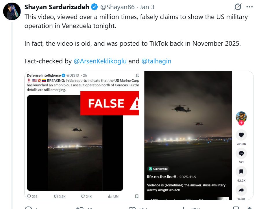 Меѓу виралната содржина беа фотографии од Мадуро како го водат американски агенти од авион, видеа од ракети за кои се тврди дека паѓаат врз Каракас и наводни сцени од граѓани кои слават на улиците, кои комбинираа вистински снимки од американски авиони со лажни визуелни елементи, објави Гардијан.