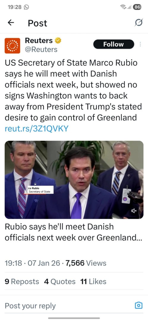 Американскиот државен секретар Марко Рубио изјави дека во текот на следната недела ќе се сретне со дански претставници и претставници на Гренланд, кој е данска автономна територија, со кои ќе разговара за желбата на Соединетите Американски Држави да го преземат Гренланд.