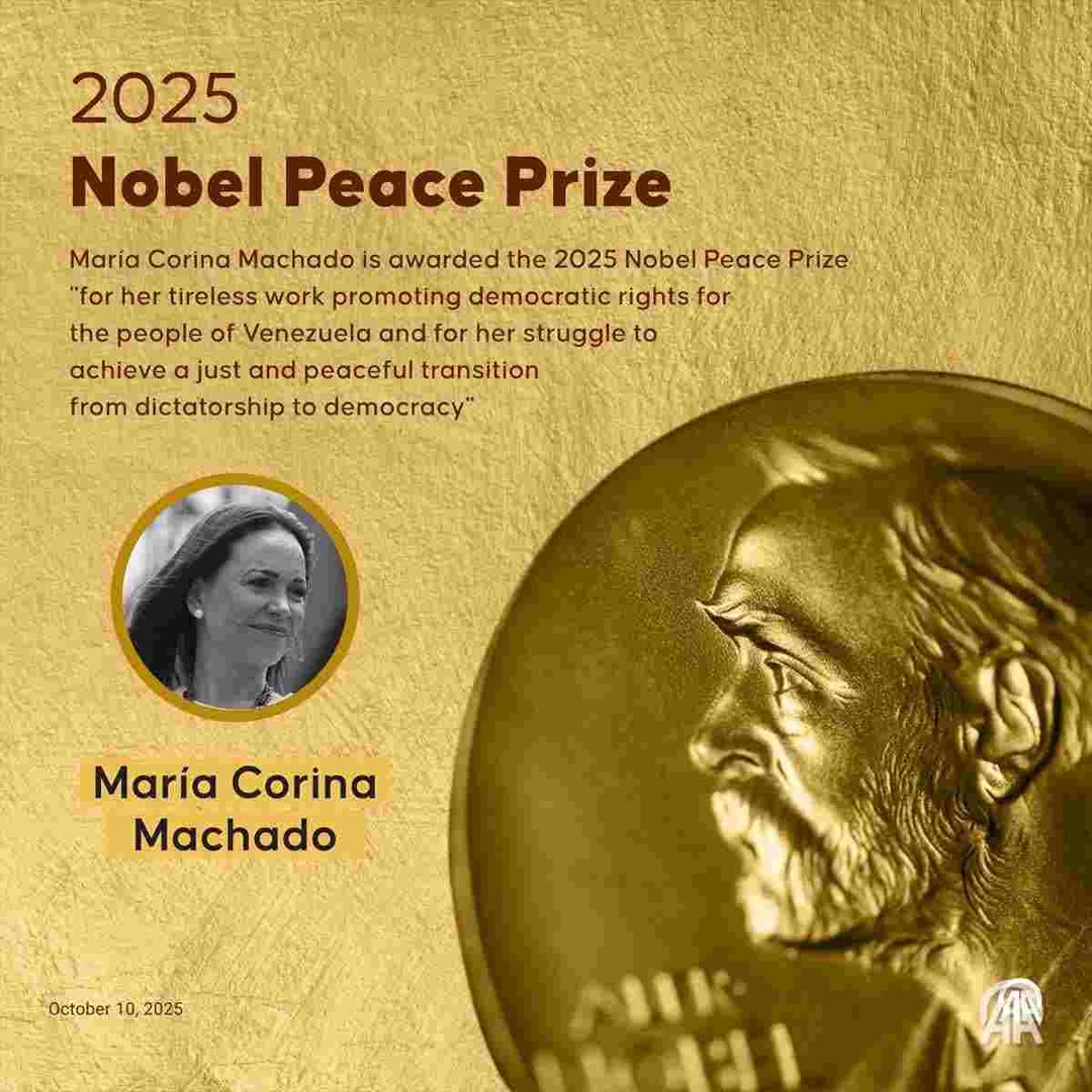 Добитник на Нобеловата награда за мир за 2025 година е венецуелската политичарка Марија Корина Мачадо, за, како што е наведено, нејзината „неуморна работа за унапредување на демократските права на венецуелскиот народ“.