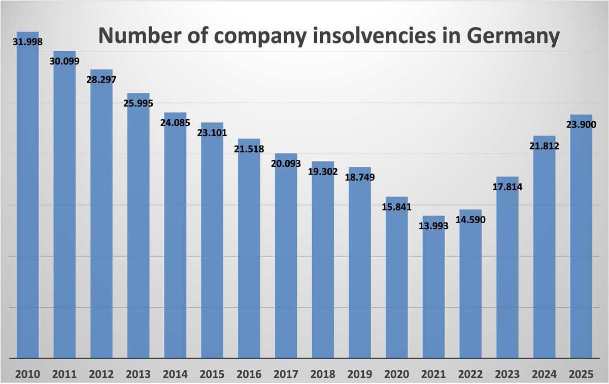 „Германија сочинува околу една петтина од случаите во светот и затоа е еден од главните двигатели на глобалната динамика на банкрот“, рече Мило Богартс, извршен директор на „Алијанц Трејд“ за Германија, Австрија и Швајцарија. Тој предупреди дека има постојан пораст на големите банкроти веќе четири години, а во 2025 година е достигнато највисокото ниво од 2015 година - и глобално а особено во Германија.