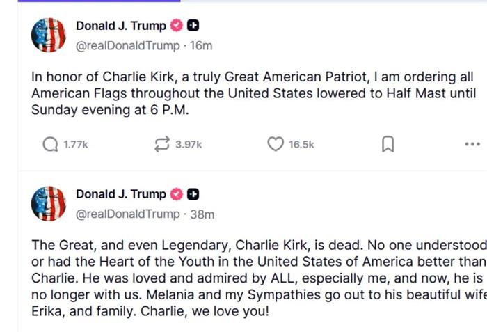 Големиот, па дури и легендарниот Чарли Кирк, е мртов. Никој не го разбираше или го немаше срцето на младите во Соединетите Американски Држави подобро од Чарли. Тој беше сакан и почитуван од сите, особено од мене, а сега, тој повеќе не е со нас. Меланија и моите сочувства се упатуваат до неговата прекрасна сопруга Ерика и семејството. Чарли, те сакаме! - напиша Трамп на социјалната мрежа Truth social.