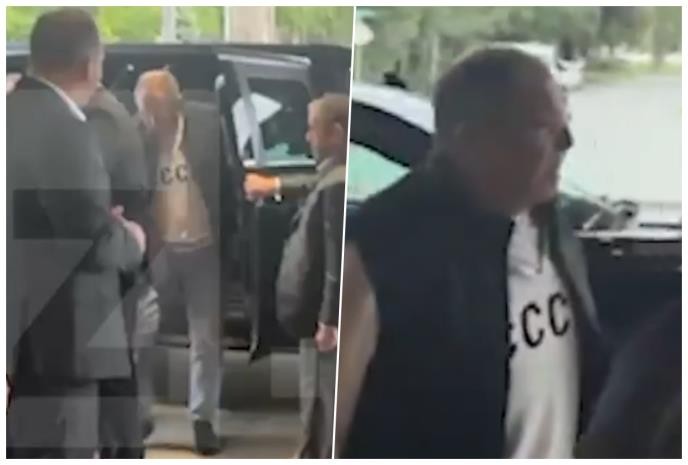 Новинарите во Алјаска го снимија рускиот министер за надворешни работи Сергеј Лавров како носи сив блузон со натписот „СССР“ видлива под црниот елек.