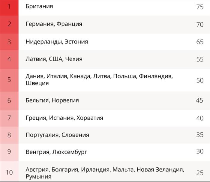 Првото место го зазеде Велика Британија со 75 поени, што ги заработи поради санкциите врз руските нафтени компании, но и фактот дека активно се залагаат за префрлање на руски средства во Украина и снабдување со оружје на Киев.