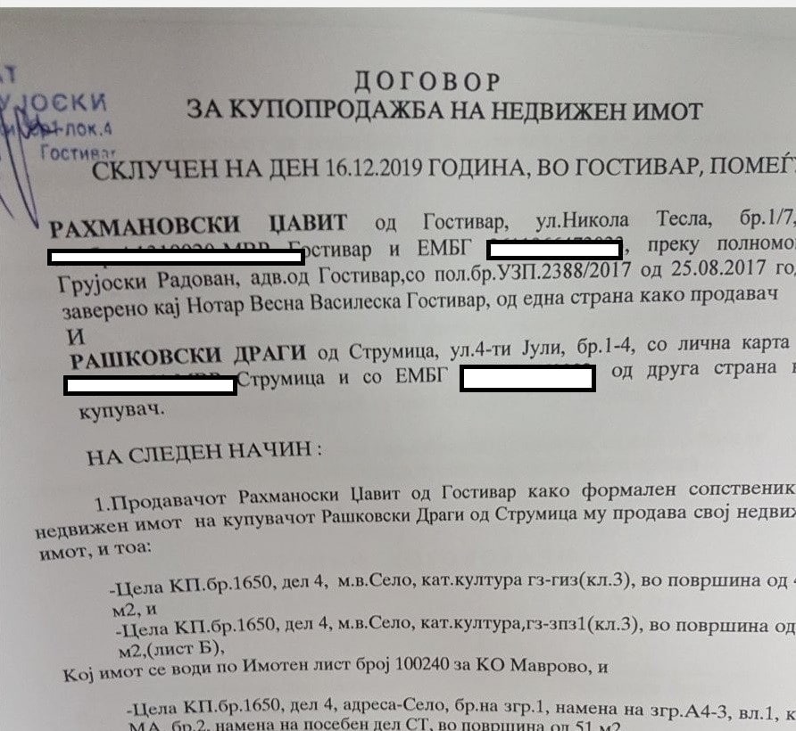 Купопродажниот договор кој го објави Лидер покажува дека Рашковски ја купил оваа викендица која се наоѓа во близина на мавровското езеро на една од најатрактивните локации во овој крај, во близина на куќата на скопскиот градоначалник Петре Шилегов.
