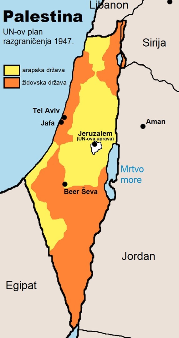 На 31 август 1947 година, специјален комитет на ОН препорачува регионот да се подели на арапски и еврејски држави, кои треба да одржуваат економска унија. Ерусалим и неговата околина требало да бидат меѓународни.