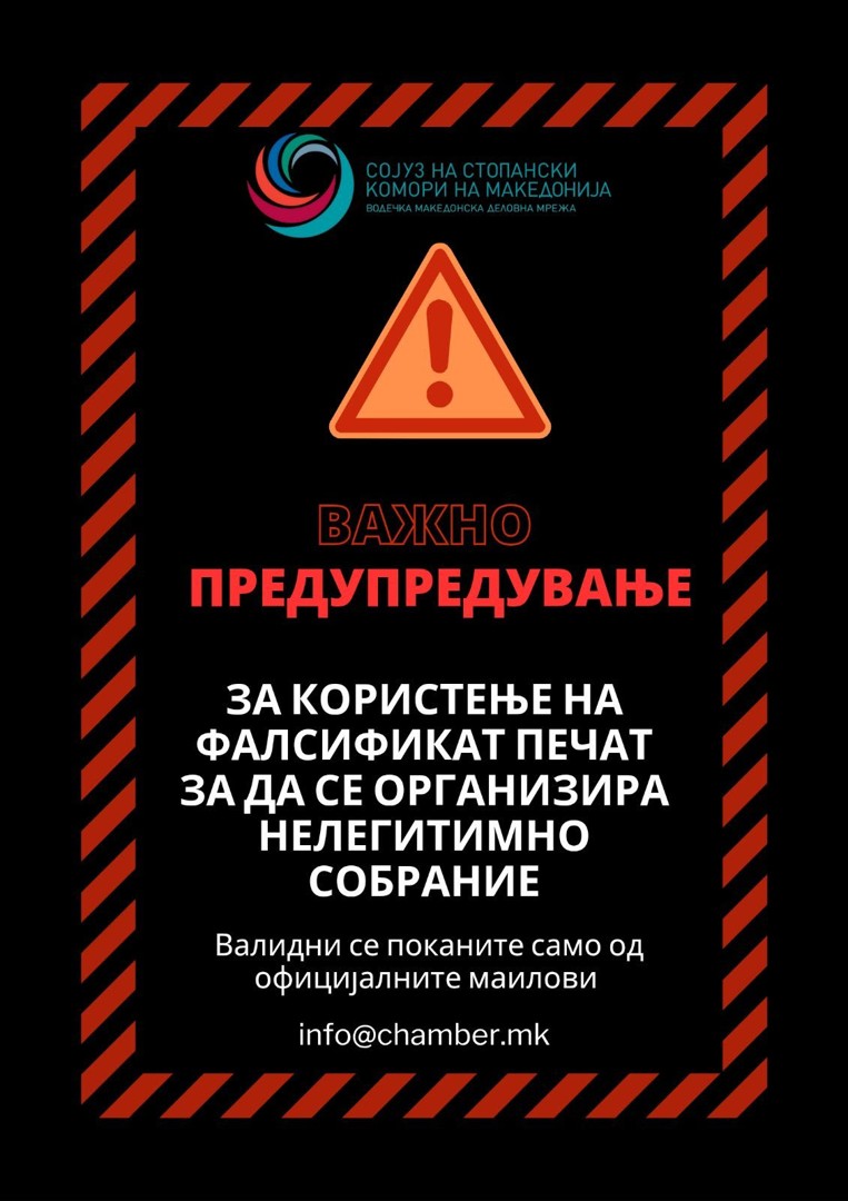 Сојузот на стопански комори на Македонија (ССК) ги информира своите членки и пошироката јавност дека се соочува со сериозен обид за незаконско и нелегитимно преземање на надлежности преку организирање на нелегално Собрание.