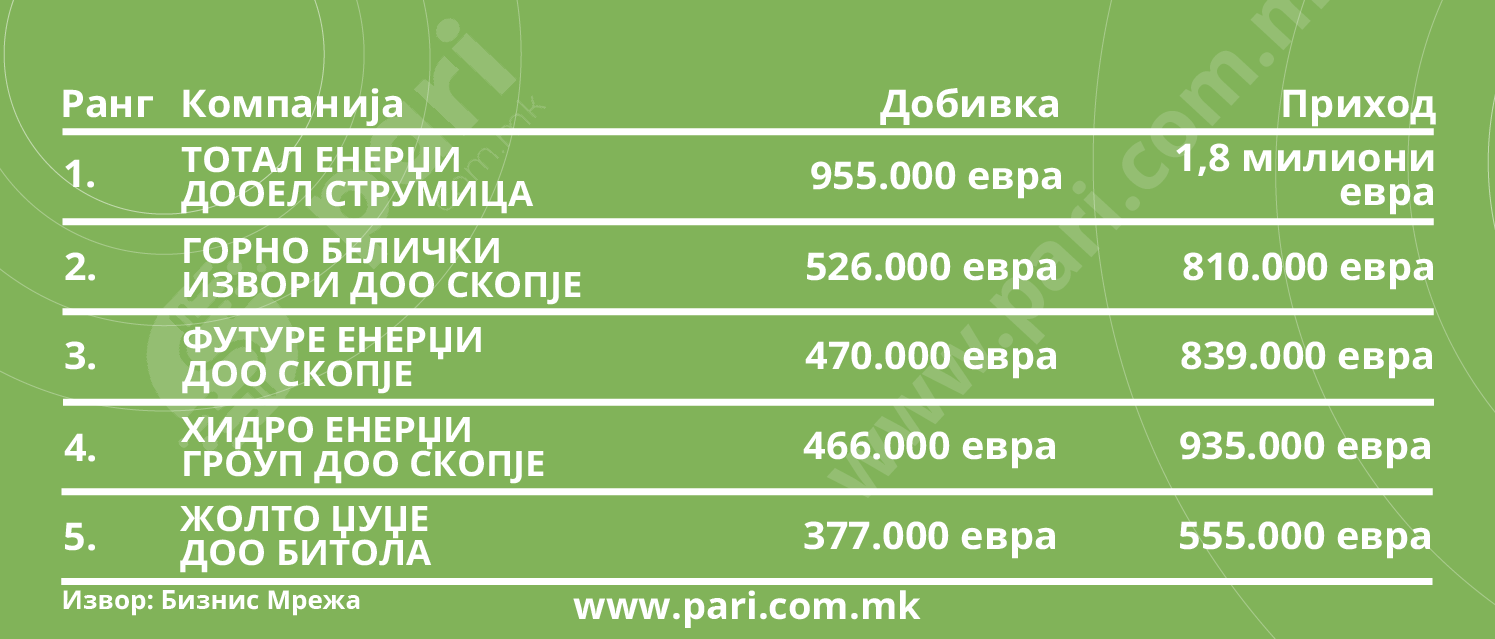 ЕВН Електрани, Централ инвест и Меј енерџи се компаниите што ги држат првите три места по добивка. Нивните добивки, како што може да се види и од табелата на компании со најголеми приходи се: 7,2 милиони евра, 2,4 и 1,9 милиони евра.