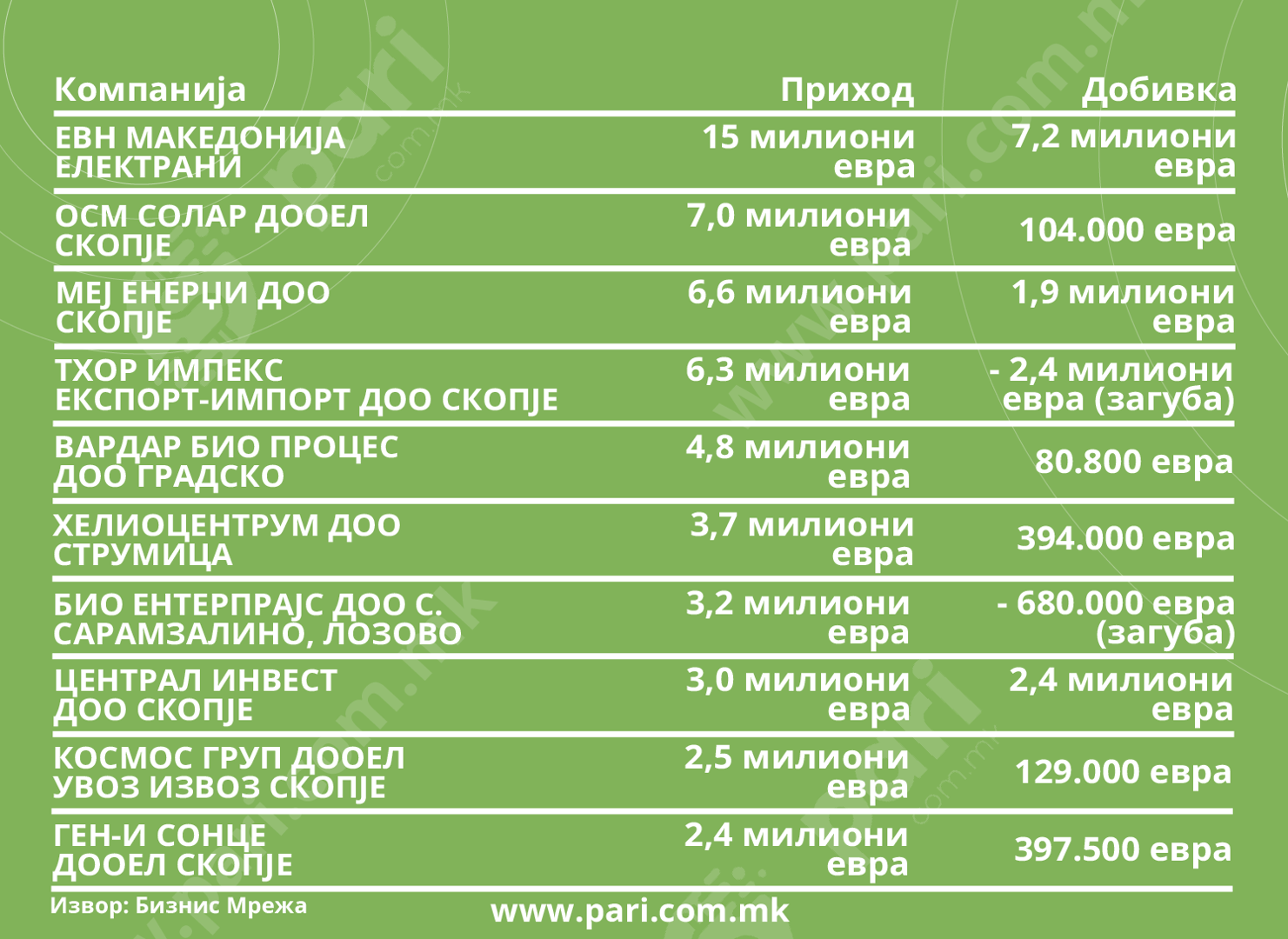 Оваа компанија е на врвот и по приход и по добивка од производство на струја од обновливи извори на енергија. Лани остварениот приход ѝ бил 15 милиони евра, но тоа е дури 29 отсто помалку отколку во 2023 година. Добивката на оваа компанија чие целокупно производство на струја е од обновливи избори на енергија, изнесувала 7,2 милиони евра, речиси половина од приходот. И оваа добивка била значително помала отколку во 2023 година, за дури 23,6 насто.