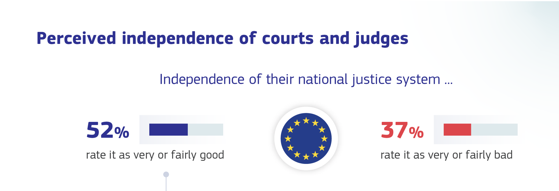 Врз основа на неодамнешните анкети на Евробарометар, 52-54% од граѓаните на ЕУ ја оцениле независноста на нивниот национален правосуден систем како „многу добра“ или „прилично добра“ од почетокот на 2024 година, а резултатите остануваат стабилни од јануари 2024 година. Оваа бројка често се користи како показател за јавната доверба во судството, бидејќи перцепираната независност и довербата се во голема корелација.