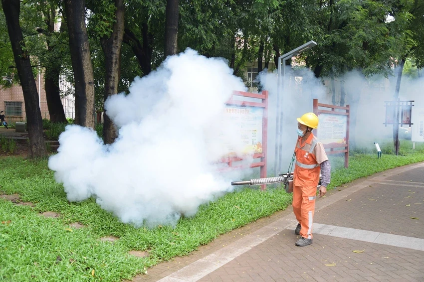 Работниците со заштитни маски на лицата прскаат средства против комарци во парковите и улиците. Во делови од Фошан се користат и дронови за откривање на извори на застоена вода.