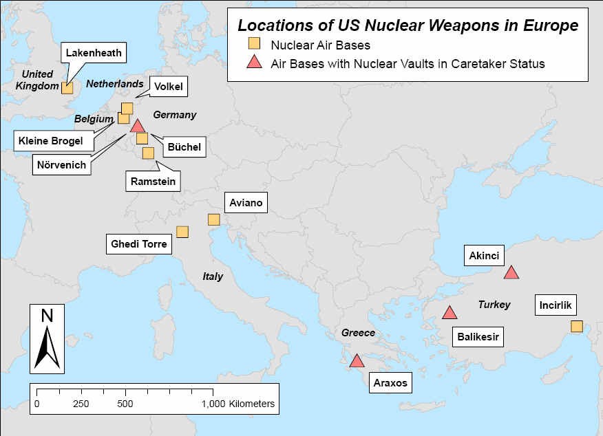 Американското нуклеарно оружје е складирано во Европа уште од Студената војна во земји како Белгија, Холандија, Италија, Турција и, неодамна, Велика Британија. Вкупниот број се проценува на околу 100, но сè уште е непознат.